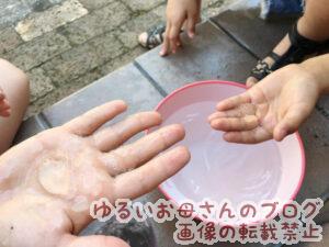地面に線路を描いて、三輪車を電車に見立てて遊んだり、逆さまにして上から砂をかけて遊んだり。